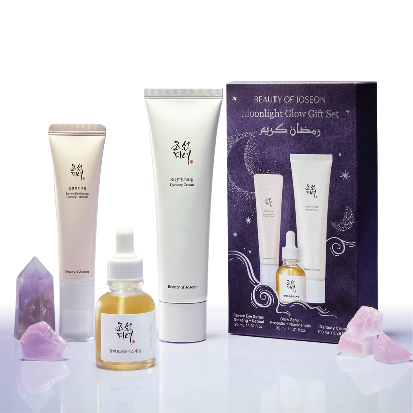 Glow Serum 30ml, Revive Eye Serum 30ml, Dynasty Cream 100ml The Joseon Moonlight Glow is a skincare ritual specifically designed to restore radiance and deep hydration. Inspired by traditional 19th-century Korean beauty practices (hanbang), this set targets dullness and signs of fatigue, making it an ideal choice for Ramadan when skin may be prone to dryness.
