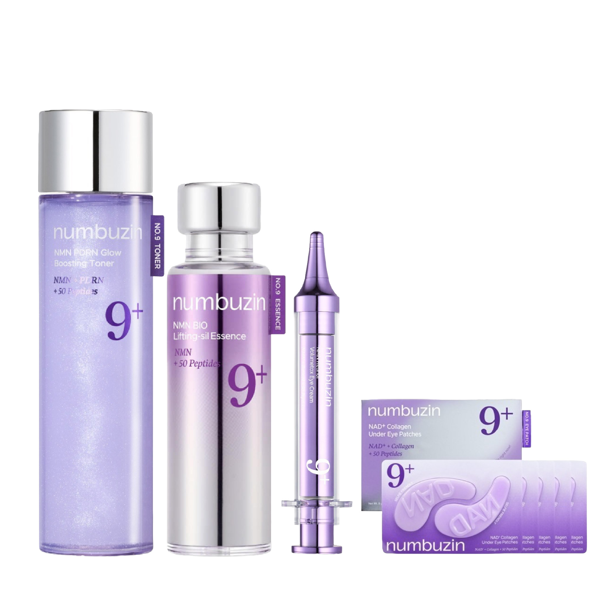NUMBUZIN No.9 NAD Bio Lifting-sil Essence 50ml, NUMBUZIN No.9 NAD+ PDRN Glow Boosting Toner 150ml, NUMBUZIN No.9 NAD+ Collagen Under Eye Patches (5ea), NUMBUZIN No.9 NAD+ Retinol Volumetox Eye Cream 10ml